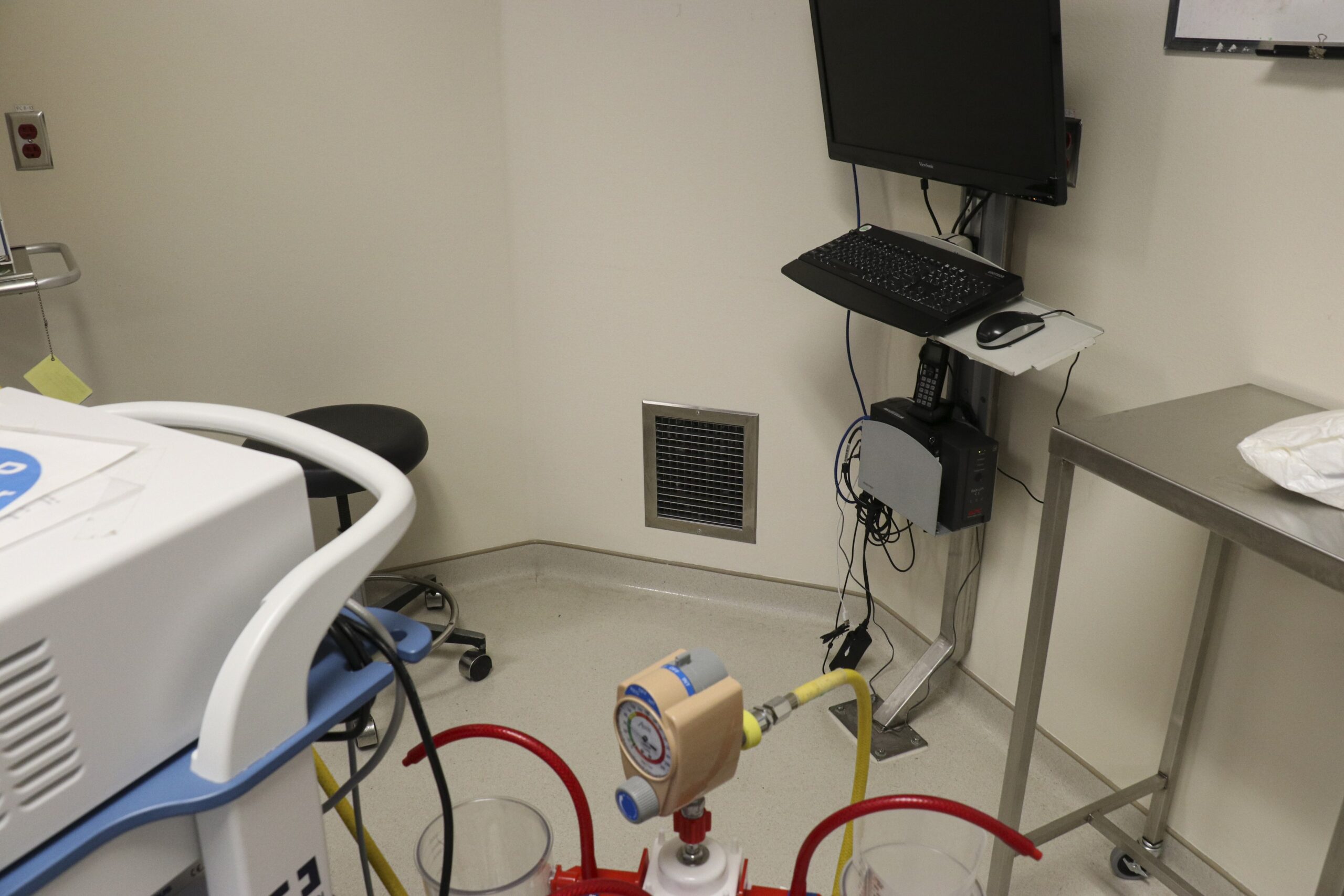The direction of airflow in the OR is also important in preventing infections. All airflow should enter the OR at the ceiling level (see rectangle vents in the top right image) and follow a downward flow to be exhausted at the floor level (see corner exhaust in the bottom right image).