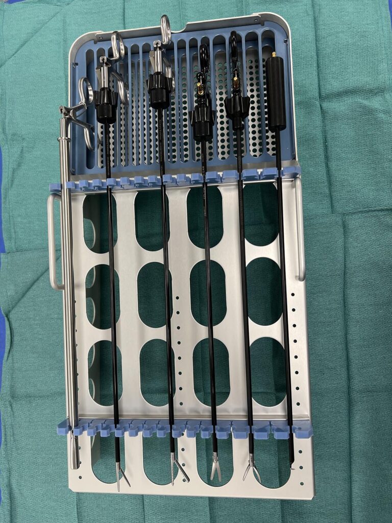 Larger trocars can also be used to allow for single-incision laparoscopic surgery by adding on a single port platform as shown below. This allows multiple instruments to enter and be used in one port site.